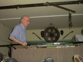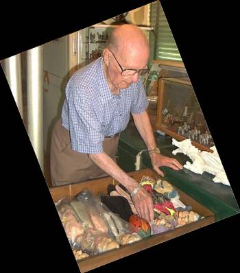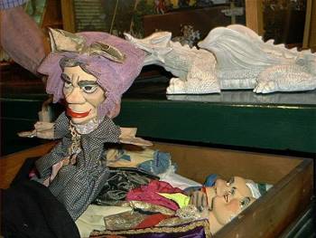 Seen here in 2003, Bernie Paul going through one of the drawers of puppets he had made. The shot on the right shows an entire drawer of puppet heads, allowing the attaching of these heads to generic bodies, to help fill out the cast for various plays. |