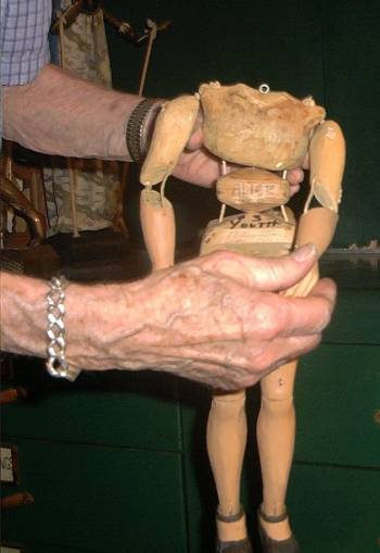 Bernie would love to show off the puppets and explain in great detail how he made each one work. Above, the stick puppet " Jimmy Cricket " is being shown, while on the right, a puppet head designed for a local wine ad on tv, shown in the 1950's, is being shown off. Below, you can see a shot of the stage, and below right, Bernie shows the sections of the puppet body he created. |