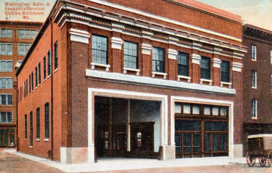 | WB&A (Washington, Baltimore & Annapolis Railroad ) First station below was on Liberty Street just south of Lexington ( Seen in the postcard below ) ............................................................................... ![]() ( Below ) Postcard view of the old W B & A Station on the Park Avenue side. ............................................................................. ![]() Another postcard view of the old W B & A Station on Park Avenue. ............................................ ![]() The building still stands today, used in later days as a bank. There have been plans for development on the block, I'm not sure how that's going to affect the old station. ................................ ![]() A look at the Liberty Street side of the building. ............................ ![]() A later station was built on Lombard Street at Howard Street. That station was torn down years ago, and the Holiday Inn with the revolving roof restaurant was built there. .................................................... ![]() Postcard view of the laterr station as seen from the street . ..................................................... ![]() Postcard below shows one of several stations for the W B & A Railroad. Kilduffs is adding the surviving station on the Maryland Railroad page. ................................................................................... |