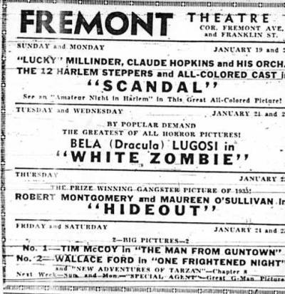 - 402 South Fremont Avenue Listed under Moving Pictures - 1909 thru 1931 Baltimore Directory Seated 500 ( right behind the bus, arched roof line ) .........