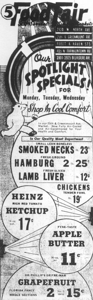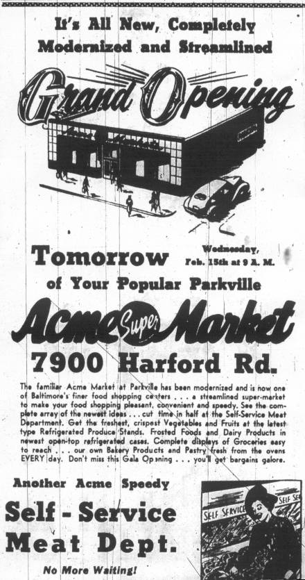 ![]() Wagner's Food Stores Chain was a much smaller chain, but a chain much remembered. Early Wagner Food Stores were located on Greenmount Avenue, St Paul Street and York Road, and the store interior ( seen below ) was on the southeast corner of Loch Raven and East Cold Spring Lane. The building is now used by various smaller stores, including a dollar store, a wig shop and a Chinese Food Carry Out. .............................. |